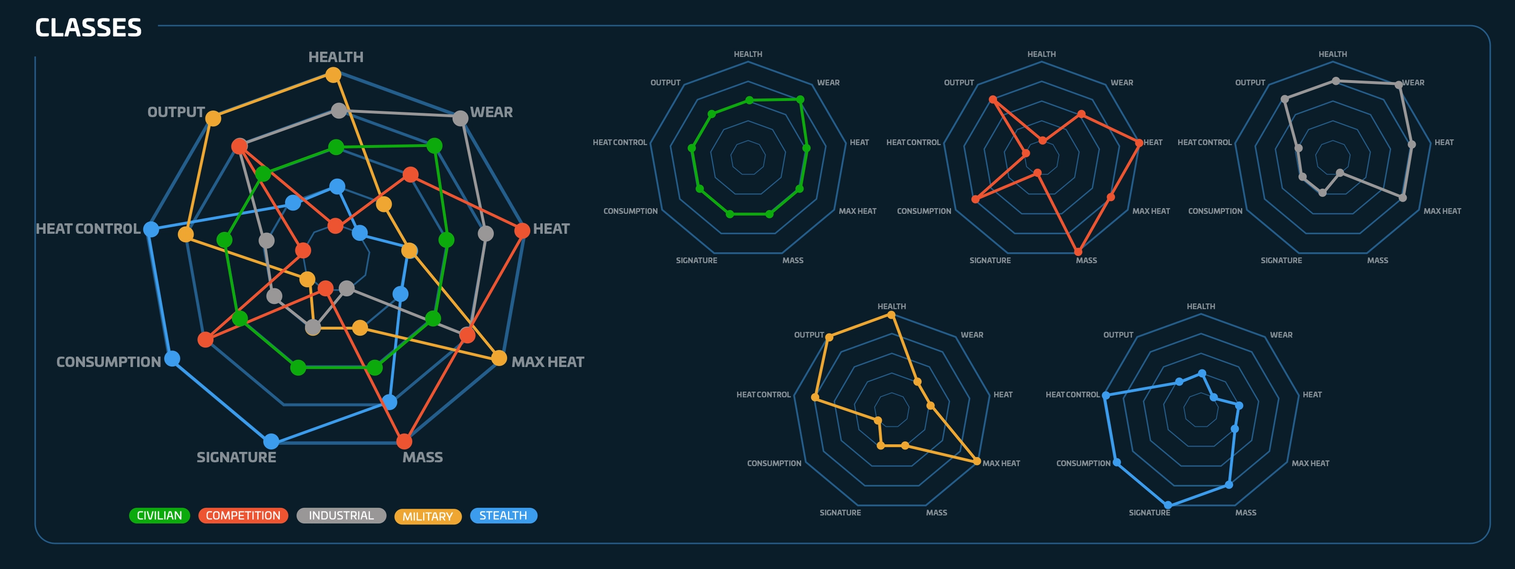 Jede Komponente hat auch eine Artikelklasse, die die Gesamtleistung widerspiegelt. Die Klassen reichen von A, was die stärkste Leistung darstellt, bis hin zu D, was die am wenigsten effiziente, aber oft auch die günstigste ist. Sie entscheiden schließlich, wie und wann Sie diese Klassen aufrüsten, um die Lebensdauer Ihres Schiffes zu verlängern und Ihren Wettbewerbsvorteil zu erhalten.